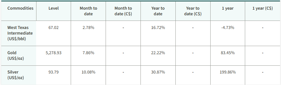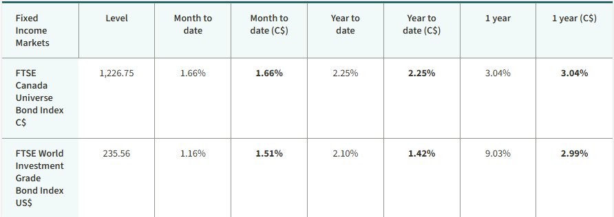 The S&P/TSX Composite Index delivered a strong return over the month, reaching new record highs. U.S. equities posted a small decline. Yields on 10-year government bonds in Canada and the U.S. declined. Oil prices finished higher over the month, as did the price of gold.